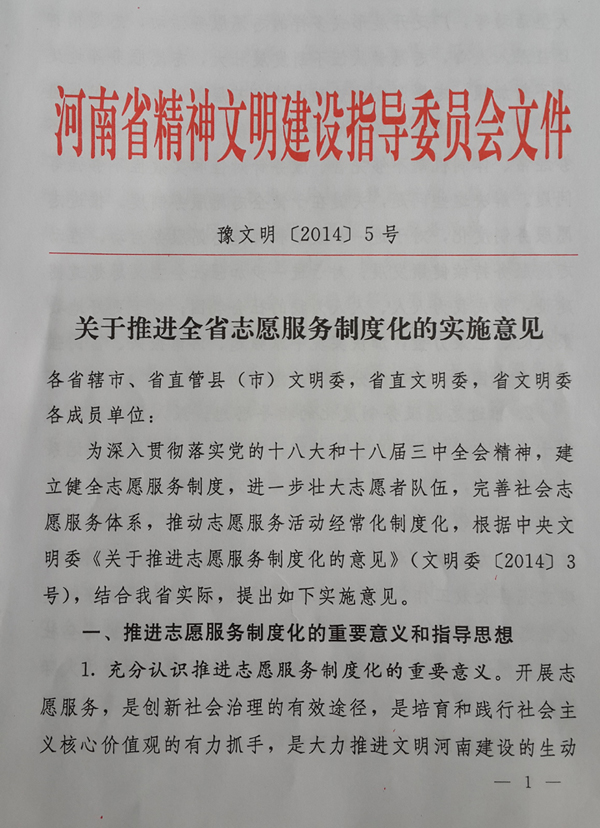 1、充分認(rèn)識推進(jìn)志愿服務(wù)制度化的重要意義。開展志愿服務(wù),是創(chuàng)新社會治理的有效途徑,是培育和踐行社會主義核心價值觀的有力抓手,是大力推進(jìn)文明河南建設(shè)的生動實踐。近年來,全省廣大志愿者圍繞扶危濟(jì)困、應(yīng)急救援、大型活動等,廣泛開展形式多樣的志愿服務(wù)活動,志愿精神日益深入人心,志愿者隊伍不斷發(fā)展壯大,志愿服務(wù)陣地建設(shè)不斷加強(qiáng),志愿服務(wù)的熱潮在城鄉(xiāng)基層蓬勃興起。但從整體上看,我省志愿服務(wù)還處于起始階段,存在著活動開展不夠經(jīng)常、體制機(jī)制不夠完善、服務(wù)針對性和實效性不夠強(qiáng)等問題。解決這些問題,關(guān)鍵在于健全志愿服務(wù)制度。推進(jìn)志愿服務(wù)制度化,對于進(jìn)一步鼓勵和規(guī)范志愿服務(wù)活動,推動志愿服務(wù)持續(xù)健康發(fā)展;對于進(jìn)一步加強(qiáng)社會主義思想道德建設(shè),形成我為人人、人人為我的社會氛圍;對于更好地凝聚人心、匯聚力量,加快實現(xiàn)中原崛起、河南振興、富民強(qiáng)省的奮斗目標(biāo),具有十分重要的意義。